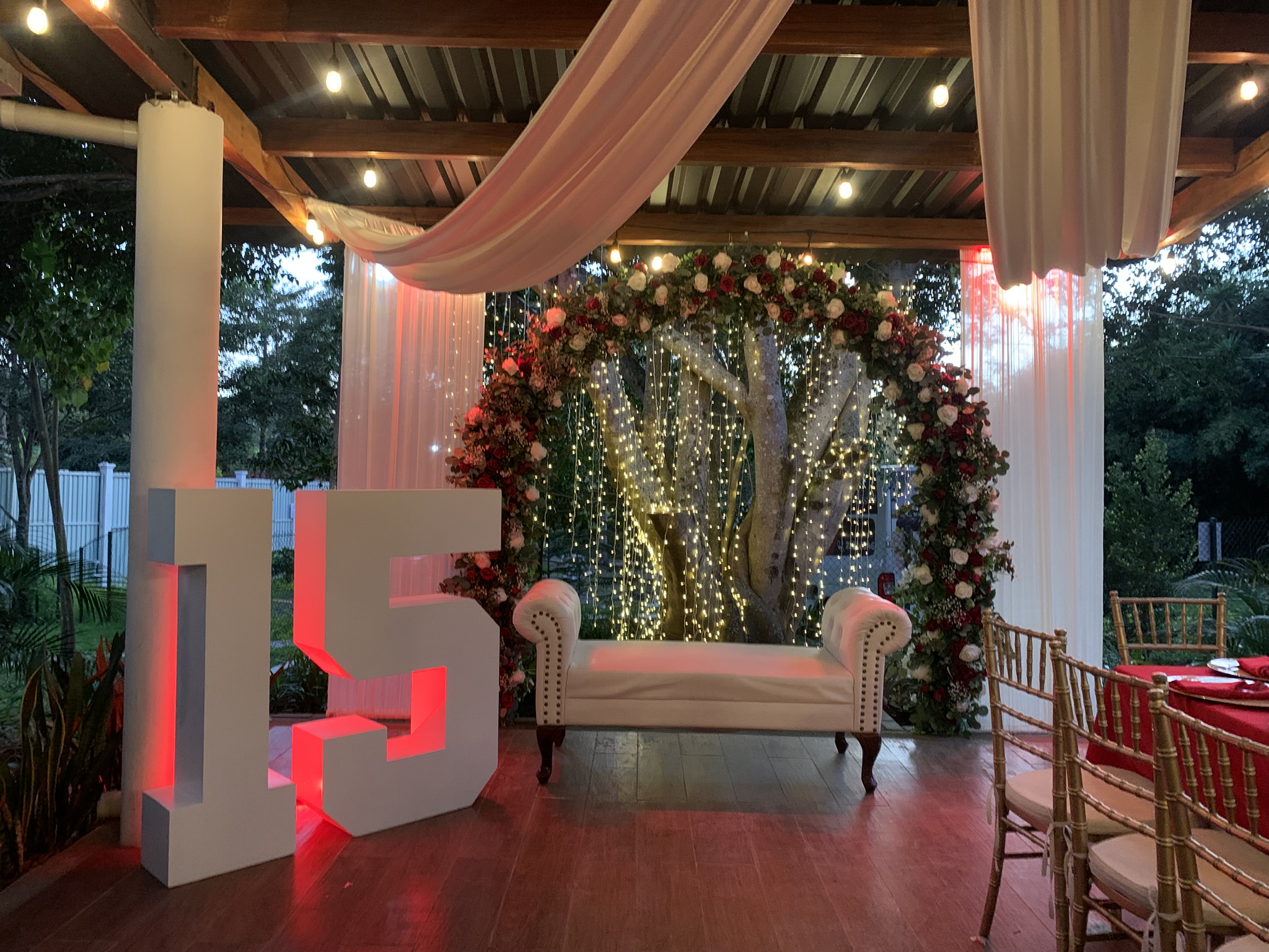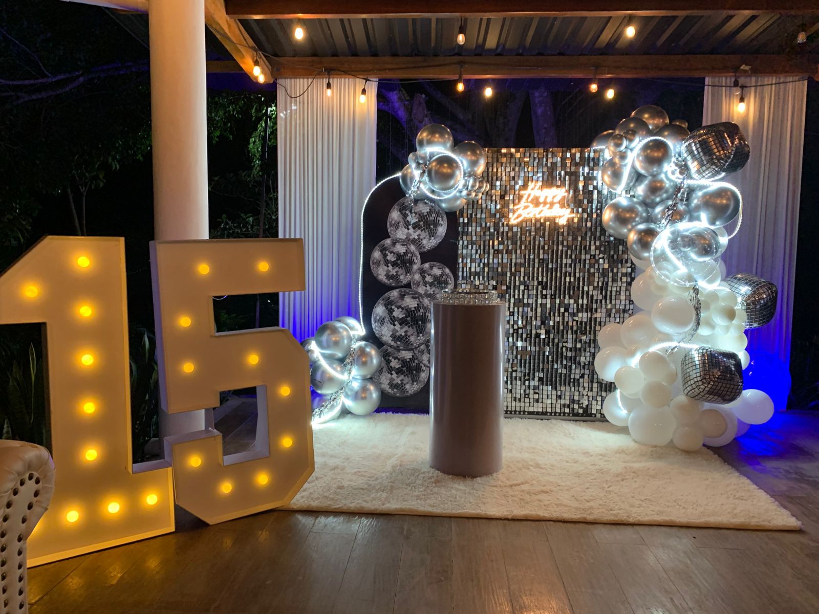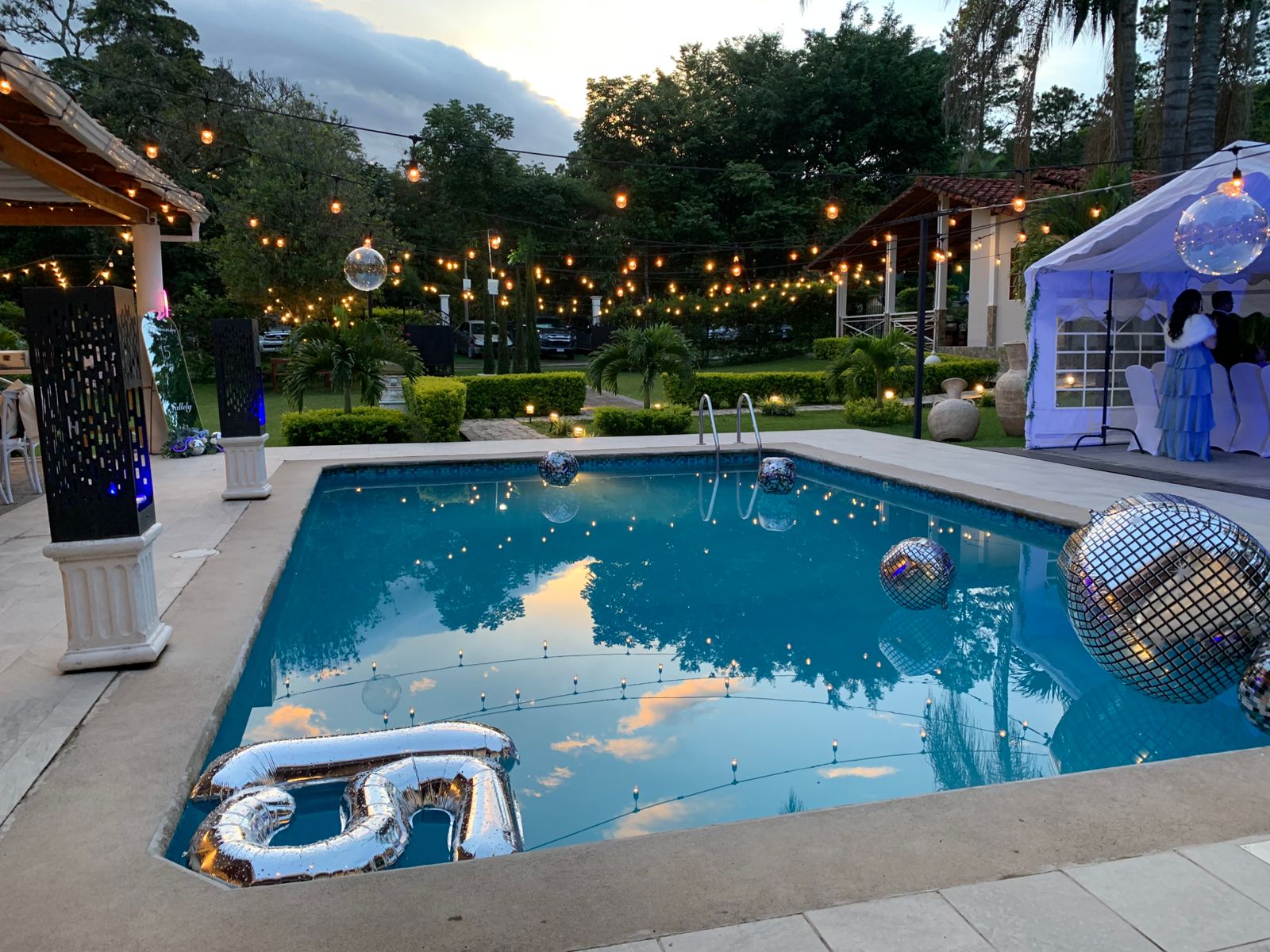 Entelado a techo de salon, luces led, centros de mesa con flor natural para mesas de invitados, letrero de bienvenida, backdrop para fotos, decoración acuática e iluminación aérea de piscina