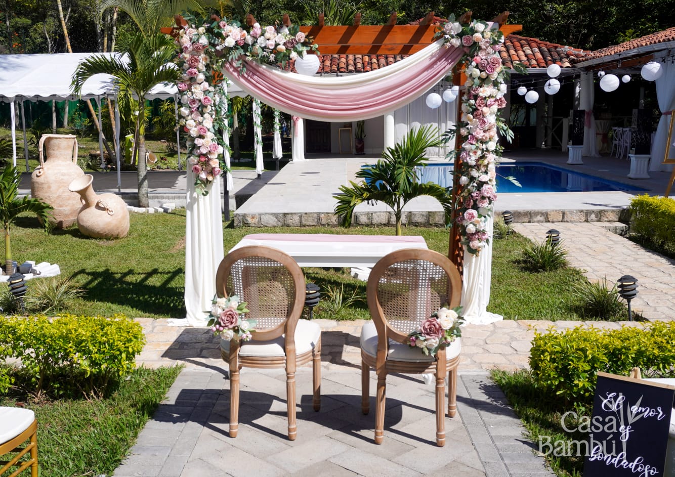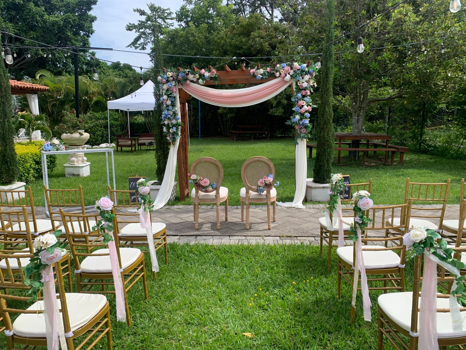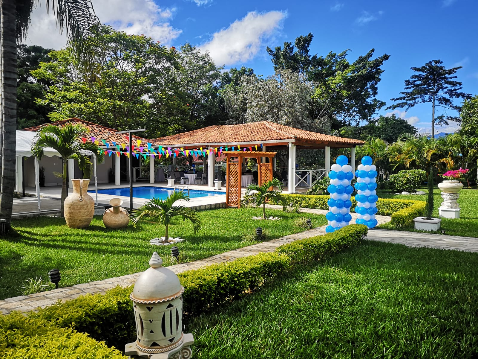 Salón de eventos, carpa 5x10 mts, área verdes, piscina, área de servicio. Mesas redondas o rectangulares con faldón y sobremantel, sillas blancas Crossback o Tiffany dorada, mesas cocteleras y sala lounge.