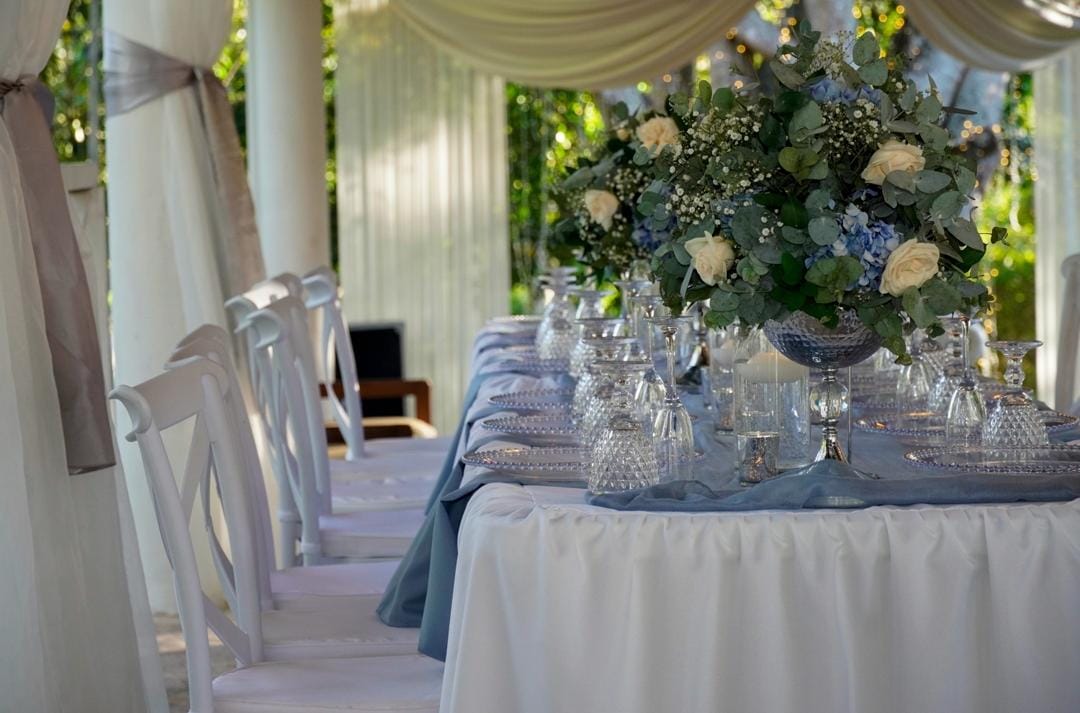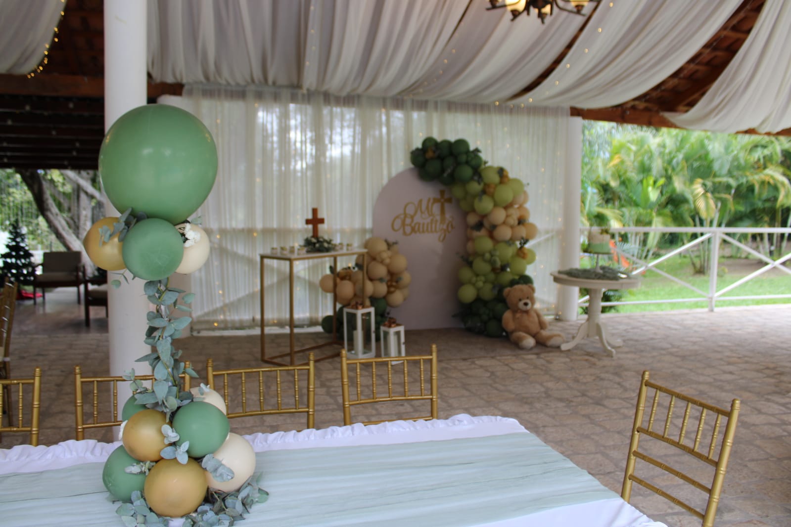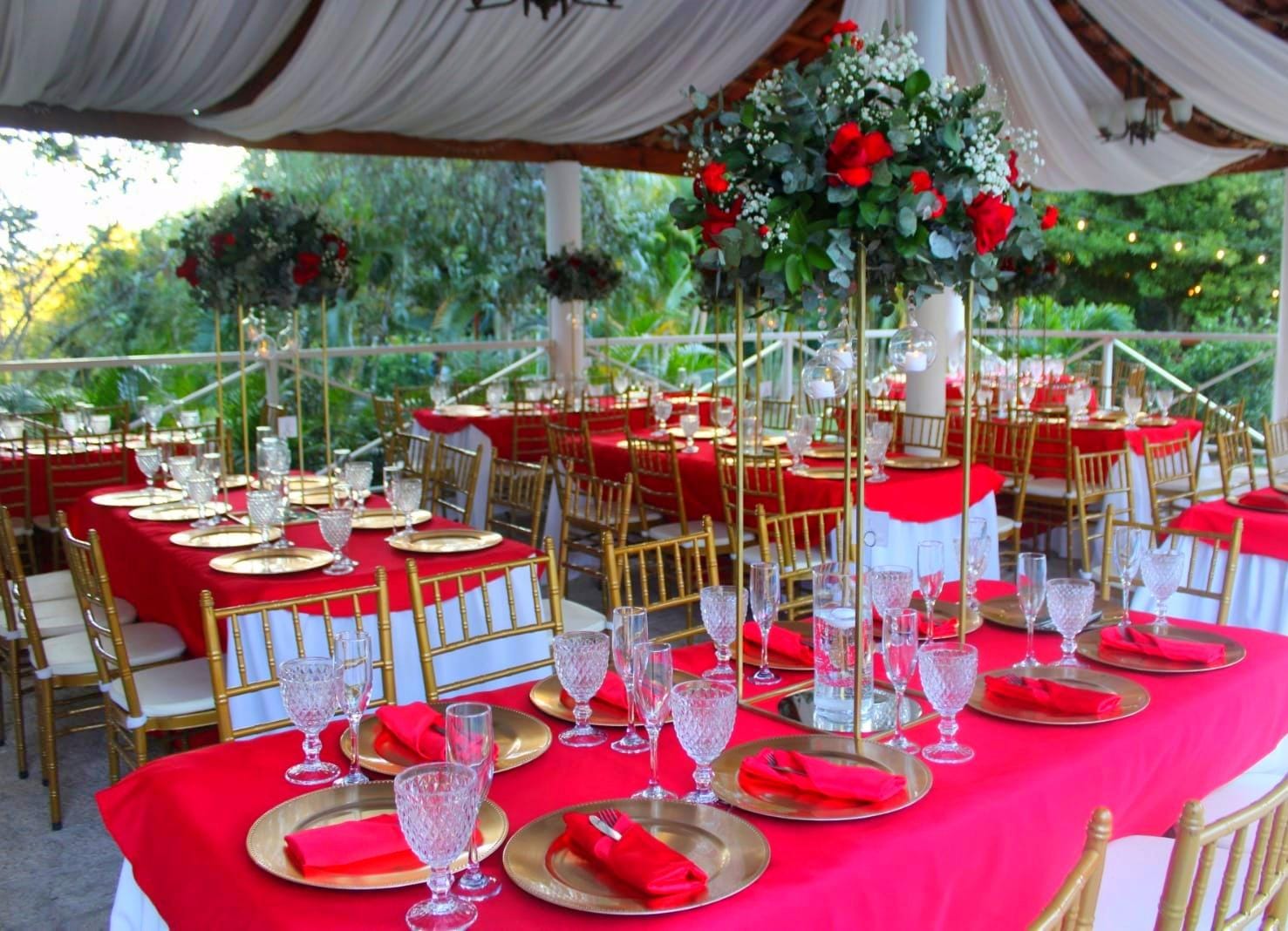 Salón de eventos, carpa 5x10 mts, área verdes, piscina, área de servicio. Mesas redondas o rectangulares con faldón y sobremantel, sillas blancas Crossback o Tiffany dorada, mesas cocteleras y sala lounge.