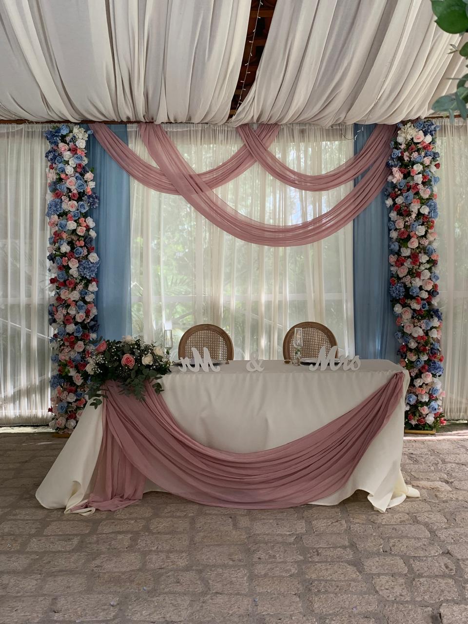 Backdrop para mesa de firma con telares y guirnaldas de flores artificiales