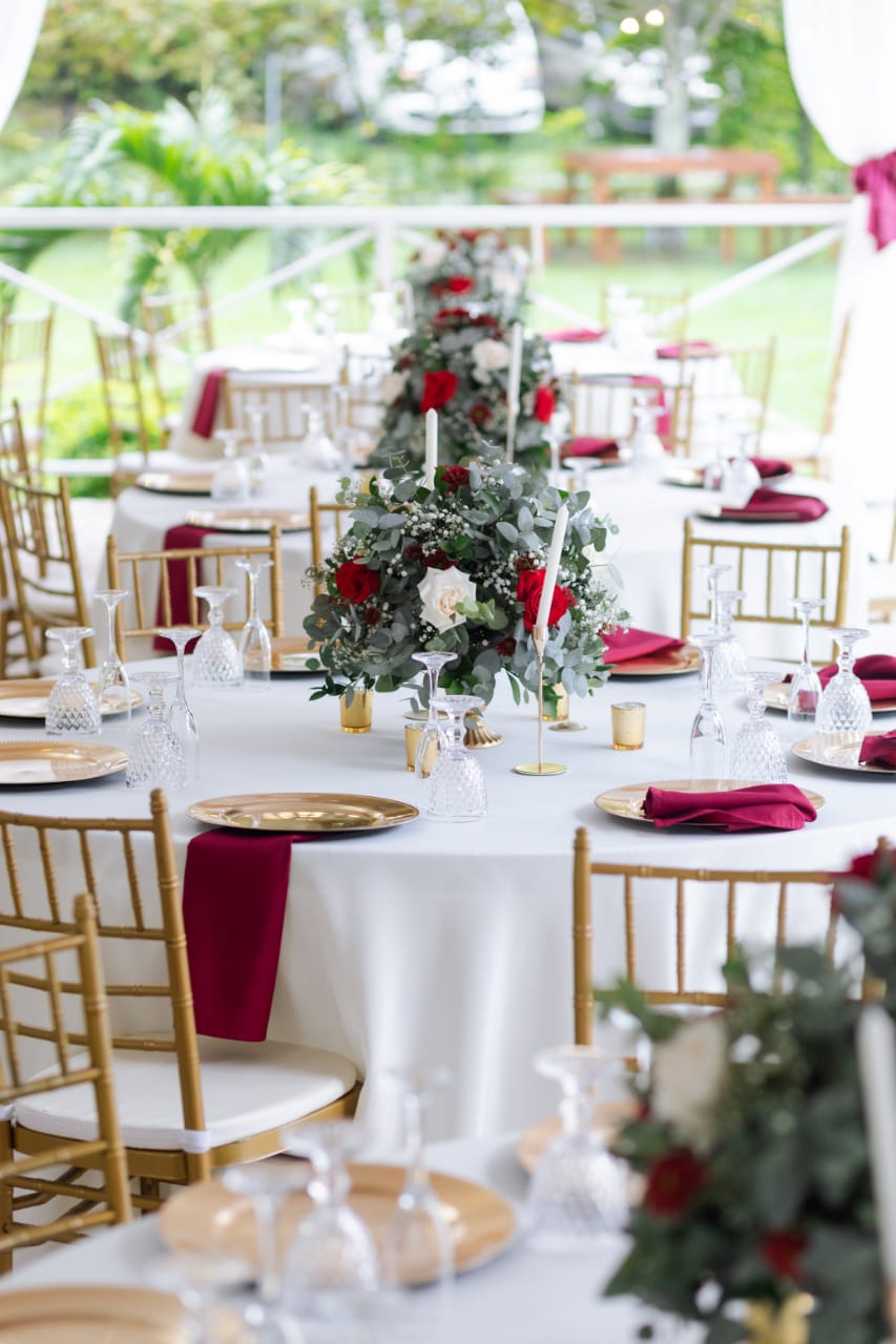 Mesas redondas o rectangulares con faldón y sobremantel. Sillas blancas Crossback y Tiffany dorada (ceremonia y recepción).Mesa para ceremonia/firma, sofá nupcial, mesa para pastel, mesa para cofre, mesas cocteleras y sala lounge blanca.