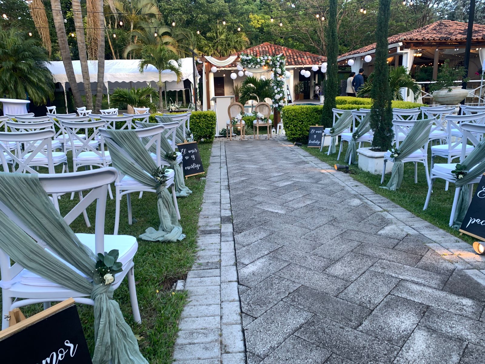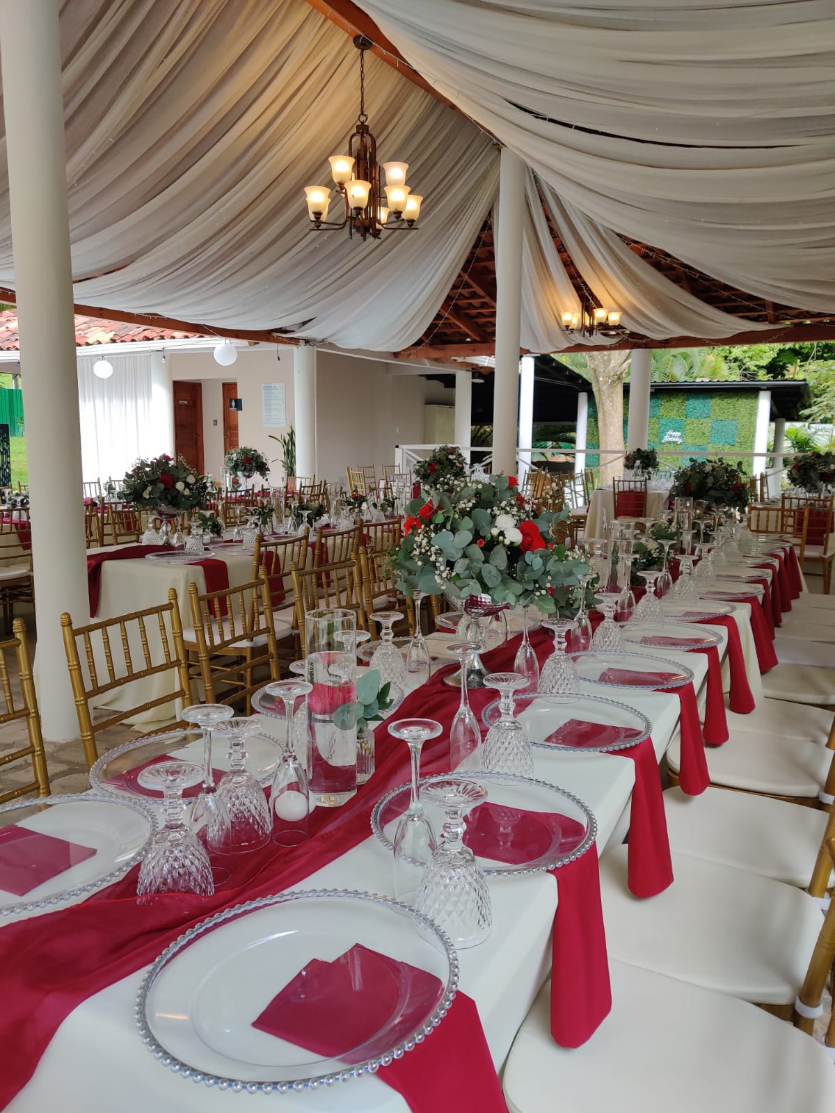 Salón de eventos, áreas verdes, piscina, área de servicio. Mesas redondas o rectangulares con faldón y sobremantel Sillas tipo banquete