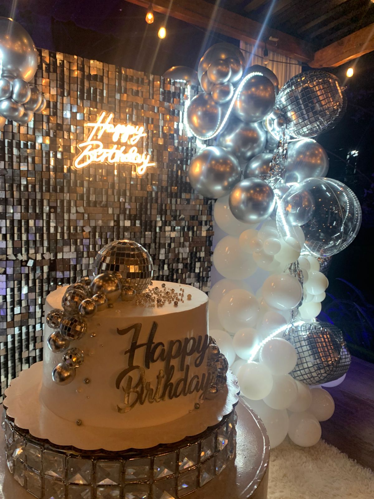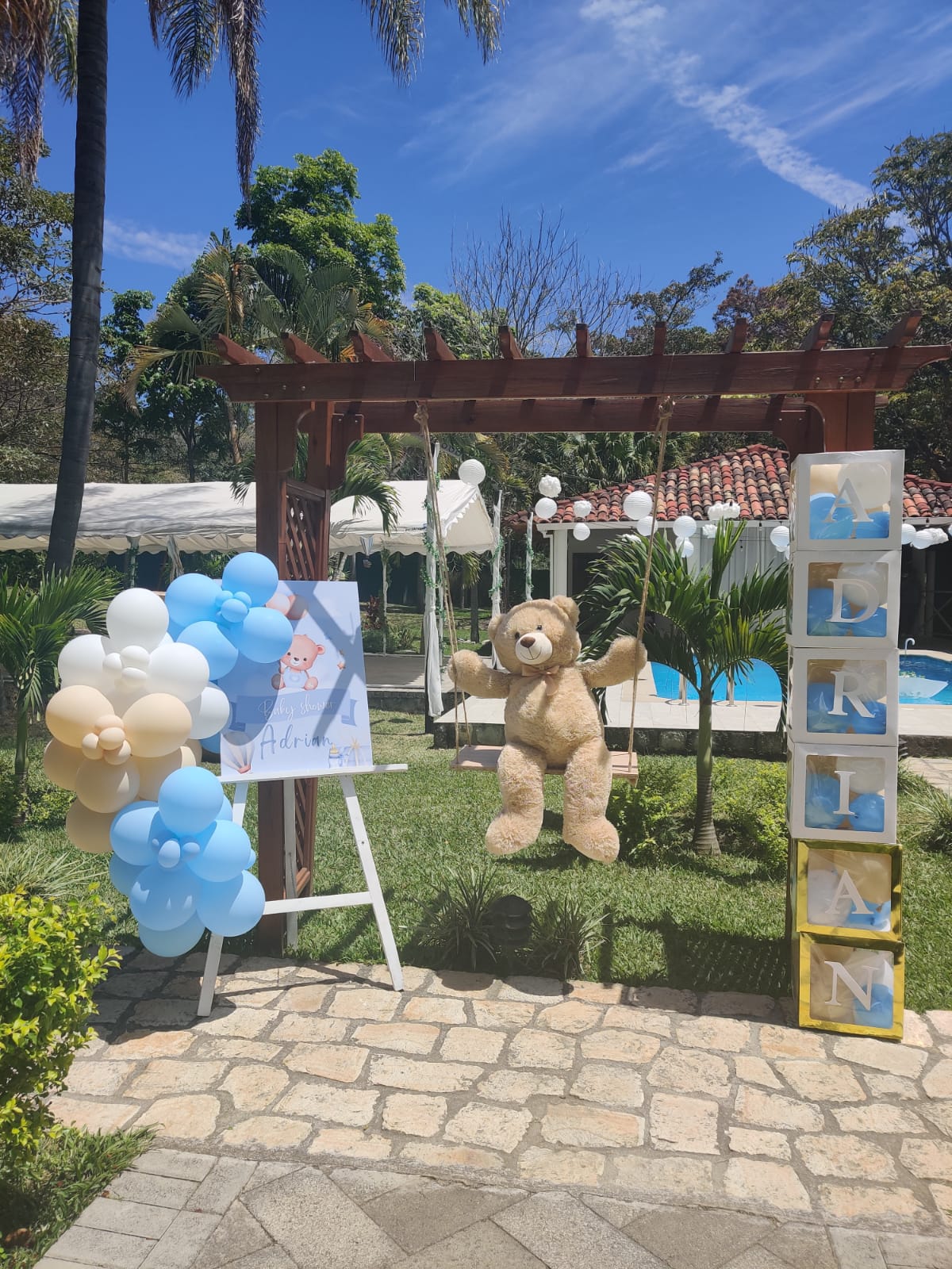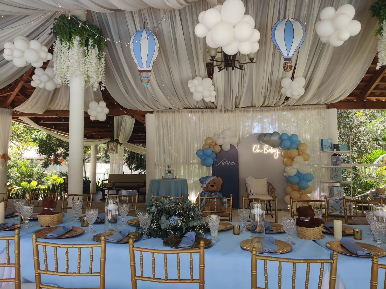 Entelado a techo de salón, centros de mesa con flor natural para mesas de invitados, decoración acuática e iluminación aérea de piscina, backdrop temático con arco de globos, telares y/o guirnalda floral), follaje y velas para mesa de pastel y cofre.