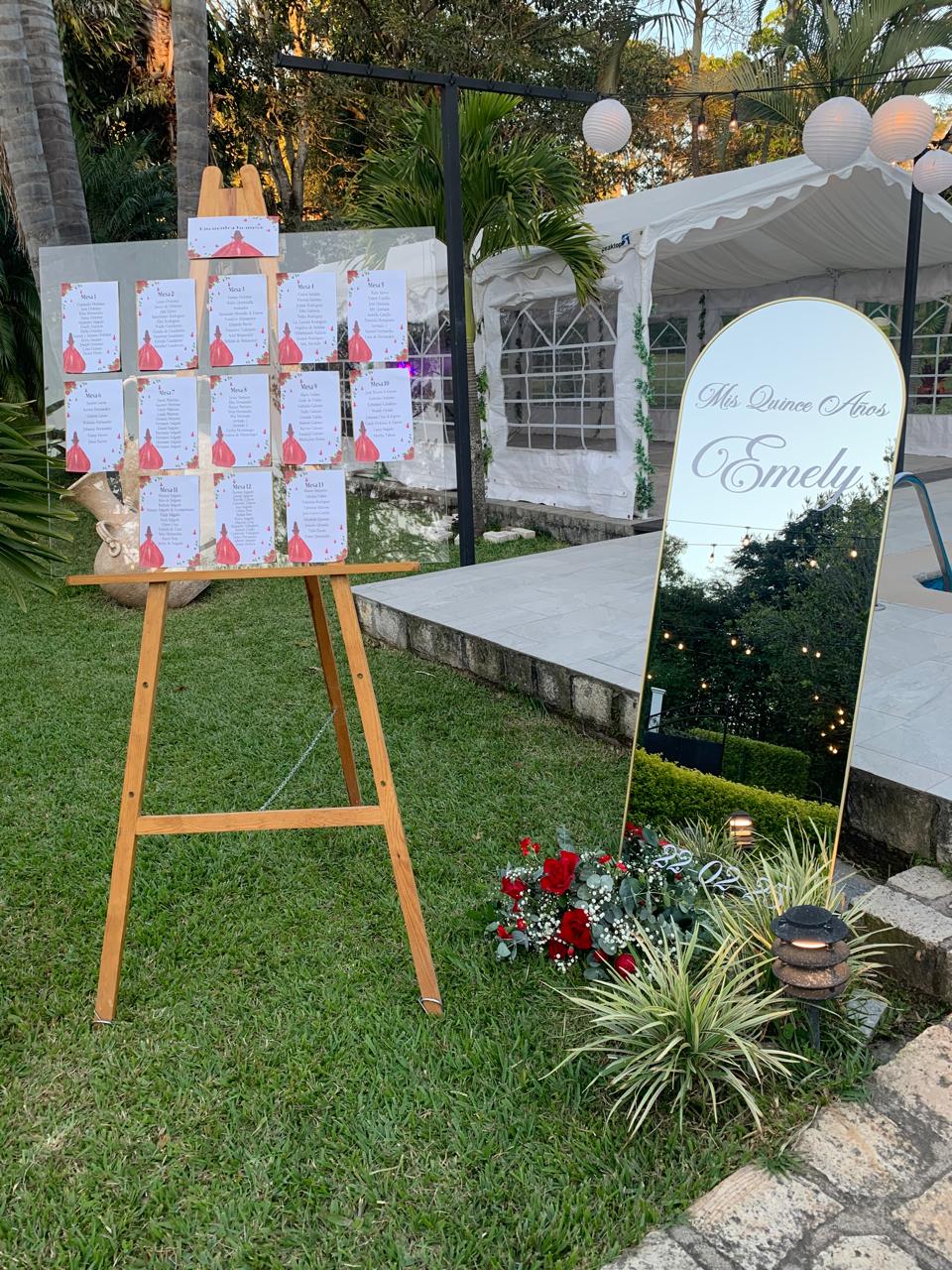 Letrero de bienvenida, Letrero y/o marco con follaje para distribución de mesas.