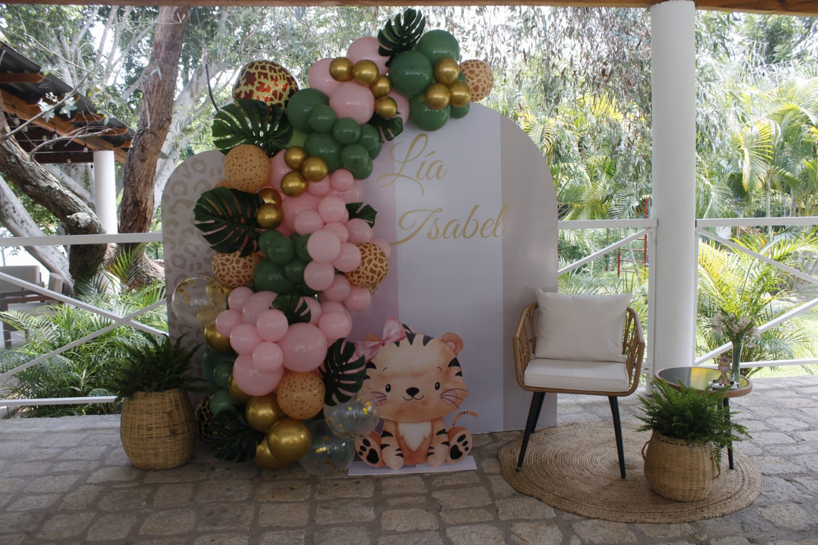 Backdrop temático con arco de globos, telares y/o guirnalda con flor artificial
